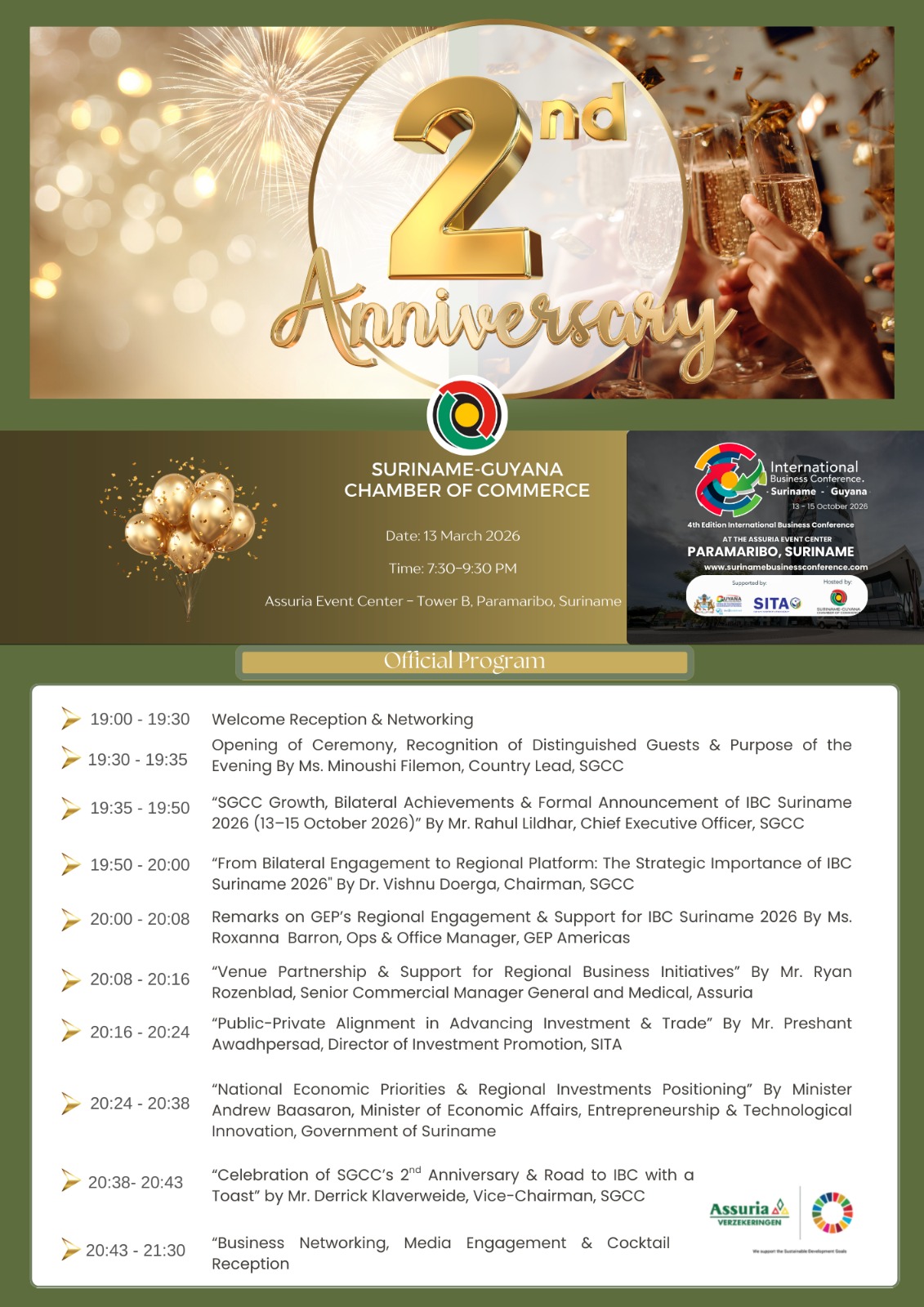 The Official Program for the evening featured distinguished speakers such as The Honorable Minister of Economic Affairs, Entrepreneurship & Technological Innovation of Suriname: Andrew Baasaron, The Director of investment promotions to SITA: Preshant Awadhpersad, as well as SGCC Board Members and Secretariat.